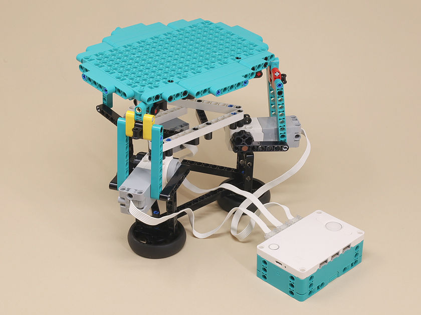This motion platform has three motors arranged in a triangular shape to control the tilt and movement of the platform. You can hold the hub in your hand and tilt it to control the tilt of the platform using the hub's gyro sensor.